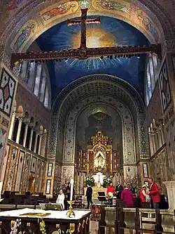 ![]() The new church opened in 1924, after two years of construction, and was consecrated in 1925. The Los Angeles Times reported that the last service in the old church was "rife with tender memories" and an "added charm and reverence pervaded the occasion."[9] When the new church opened the following week, the Times called it "one of the most beautiful and costly edifices in the country."[10] Another report noted: "Critics declare it the most beautiful in Los Angeles."[11] Built at a cost of $650,000 (approximately $9.17 million in 2023[12]), the church was described at the time as a "close copy of an Italian church of the sixth century in built at Toscanella."[10] The church's walls are made of reinforced concrete two and a half feet thick clear to the roof, and the structure is 69 feet from floor to ceiling.[11] The wood-beamed ceiling is a reproduction of a church ceiling from the 11th century at San Miniato, near Florence.[11] The altar is made of Italian marble, and the triptych was carved by Oberammergau workmen.[11] The interior includes a stained glass window featuring Martin Luther King Jr., installed in 1977. Other windows include a Romanesque rose window. Another striking feature of the church is found in the gold mosaics on the chapel walls. One mosaic depicts the Virgin Mary and Christ child modeled after a 13th-century mosaic at the Cathedral of Santa Maria Assunta in Torcello, Italy. There is also a mosaic of Jesus as judge, holding a Bible and giving a blessing, a 12th-century convention.[8] At the time the new church opened in 1924, St. John's had 2,000 communicants on its membership list and was the largest Episcopal church west of Chicago.[11] In 1947, The Seven Angels mosaics were added to the church at a cost of $150,000 (approximately $1.61 million in 2023[12]). The figures of the angels, each eight feet high and holding a musical instrument, were made of Italian marble with gold mosaic and stand in arched panels. The mosaics were created in Italy by five artists who spent two years working on them.[13] ![]() |