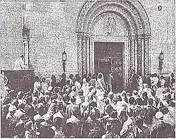 In 1970, Carter drew media attention when he closed the large ceremonial front doors of the church as a protest against the Vietnam War. He noted that the doors were closed "as a sign of our penitence and sorrow, as well as protest. Penitence for our silence and hence our part in the bloodshed. ... Protest that once again our beloved country has chosen guns and bombs instead of other means of reconciliation."[15] The doors remained closed for three years until the war ended. ![]() At the April 1973 ceremony at which the doors were reopened, Carter noted, "This is no moment of triumph. We reopen our doors as an affirmation, to a peace ... which will offer mankind a new life on this planet."[15] The ceremony was interspersed with the sounding of a shofar, the ram's horn traditionally used in Jewish services. Though he considered the peace to be no more than an "armistice" enforced by the "terror of nuclear warheads," Carter said that the church "chose this moment to signify our thanksgiving that our bombers no longer rake the ravaged land, that our prisoners of war are finally home and our fighting forces withdrawn (from) an enterprise which drained the spiritual as well as the material resources of our land."[15] In recent years, the St. John's community actively voiced its opposition to the War in Iraq and other interventions in the Middle East. Each Sunday, the names of each American military person who died in the war were read at the church's services. A banner at the back of the church had a cross marked for each American death in the war. And during the procession of the palms during Palm Sunday services, members of the congregation carried anti-war protest signs along with their palms. |
