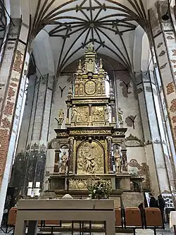 The interior is adorned by several ornamental altars, epitaphs and commemorative tablets of noble individuals, though their number is small and the overall inside appearance is bare due to wartime destruction and current purpose.[14] Nonetheless, some of the city's most important altars are located at St. John's, which over the course of history had many patrons.[14] For example, the artist Abraham van den Blocke created a monumental Late Renaissance altarpiece dedicated to John the Baptist, which was restored in the aftermath of World War II.[15] The presbytery (chancel) also contains numerous medieval as well as Early Modern polychromes and inscriptions.[16] Moreover, fragments and chippings of the original wall plastering have been preserved throughout the church.[17] The ceiling comprises a lierne, also known as a stellar vault.[4]