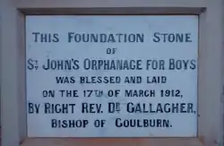 On 17 March 1912, the foundation stone of the orphanage was laid and blessed by Bishop Gallagher of Goulburn.[1][10][11] However, the orphanage was not opened officially until December 1913, when the opening ceremony was held on a Sunday afternoon, and the building was opened and blessed by Bishop Gallagher.[4][12] The ceremony attracted a large audience, many of whom were not members of the Catholic Church. By 3:30 p.m., the Australian Light Horse Band began marching towards the orphanage from a cathedral on Verner Street. The priests and the bishop brought up the rear walking behind several Catholic acolytes. While many attendees remained at the orphanage, hundreds walked along with the procession. Children who had marched with the procession were divided and formed a guard of honour. The bishop, who was accompanied by Father Cahill, entered the building and blessed it; a crucifix was subsequently placed in the main dormitory of the building. After the blessing, the bishop addressed the attending crowd from the front verandah, and discussed the use of the building.[4] In addition, the Bishop went on to say that Pagan civilisations consign orphans to death or slavery:[13]