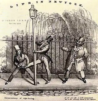 By 1827, the "ornate and elegant"[21] neighborhood had achieved a fashionable status, with residents from the "first families" of the city[6] such as Hamilton, Schulyer, Delafield, and Tappan,[17] as well as William Paulding Jr., the mayor of New York City from 1825-1826 and 1827-1829.[22] At around the same time the name "St. John's Park", after the church, had begun to be used instead of "Hudson Square".[12] The square's "polished elegance",[22] which was "in a class with Washington Square and Grancery Park"[16] only lasted a single generation,[22] from 1825-1850.[23] During this time, one observer called it "the fairest interior portion of the city",[17] and the Evening Post in 1847 called it "a spot of Eden lovliness .. It seems as if retiring from the din and tumult of the noisy town to enjoy its own secret solitude.[16]