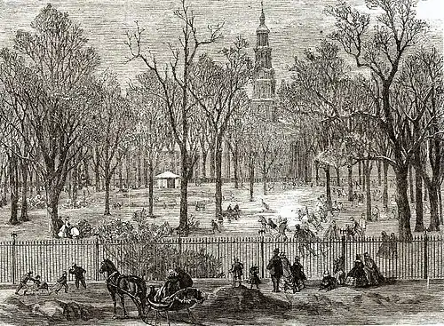 The square and park began to attract upscale residents,[11] and was continually upgraded, with the addition of gaslight and curbstones, the laying out of streets around the square – which the church laid out, graded and named, but then ceded to the city,[18] the construction of a fence around the park in 1866[5] to which residents received keys, and extensive landscaping,[12][6] including gravel paths and flowerbeds, and trees such as catalpas, cottonwoods, horse chestnuts and silver birches.[17] In addition to serving the local residents, the park was used for church events, including annual festivals for children of the parish.[19] During the coldest winters, the park trustees flooded the park to create a large ice skating rink.[20]