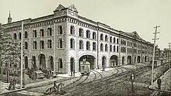 The fireproof terminal, which could accommodate 96 cars on 8 tracks and was an important shipping point for goods heading west, employed 30 office clerks, and as many as 300 laborers who dealt with up to 140 cars that might pass through in a week. There were two platforms for the transfer of goods, and the top two stories of the terminal were the Frederick C. Linde warehouse, for both general and cold storage. The terminal was well sited to handle dry goods and groceries from wholesale merchants in the surrounding area. The line of carts waiting to load or offload backed up West Broadway to Canal Street, and was present around the clock.[27]