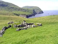 In modern times, St Kilda's only settlement was at Village Bay (Scottish Gaelic: Bàgh a' Bhaile or Loch Hiort) on the east side of Hirta. Gleann Mòr on the north coast of Hirta and Boreray also contain the remains of earlier habitations.[36] The sea approach to Hirta into Village Bay suggests a small settlement flanked by high rolling hills in a semicircle behind it. This is misleading.[37] The whole north face of Conachair is a vertical cliff up to 427 metres (1,401 ft) high,[38] falling sheer into the sea and constituting the highest sea cliff in the UK.[39]