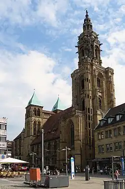 Kilian's Church on Kaiserstraße (Kaiser Street) in Heilbronn is a Gothic hall church constructed from Heilbronner sandstone, whose origin dates back to the 11th century. Its western tower, constructed by Hans Schweiner, is one of the first major Renaissance buildings to be built north of the Alps.[1] Inside the church there is an altar by Hans Seyffer from 1498, which is regarded as a masterpiece of sculpture from the Late German Gothic period. Some of the stained glass is by Charles Crodel. The Monument Foundation of Baden-Württemberg appointed the church as monument of the month in December 2016.