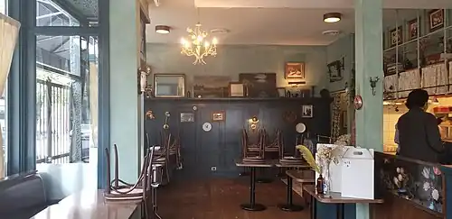The restaurant was designed by Craig Straghetta's Vancouver-based studio Ste. Marie, which designed Poirier's earlier restaurant Ask For Luigi, as well as other Vancouver restaurants such as Kissa Tanto and Botanist.[10] Poirier asked for a space that did not feel designed and looked "like it's always been there", so Straghetta worked to invoke the feeling of a cozy rural home "turned into a restaurant in the middle of the city".[11][12] The original colour scheme for the restaurant used cream and faded yellow, but was changed to a blue and green palette after the designers sampled the proposed menu.[12] The French-speaking staff and French background music are intended to make patrons feel as if they are not in Vancouver. Reviewers have described the environment as having a similar feeling to eateries in Montreal or Quebec City, Quebec.[1][4][13]