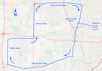 The start included five laps, or 12⁄3 miles (2.68 km), around the stadium track.[5] The remainder of the course was on dusty country roads, with race officials riding in vehicles ahead of, and behind, the runners: this created dust clouds that exacerbated the severely hot and humid conditions,[6] with a temperature of around 90 degrees Fahrenheit (32 degrees Celsius) at the starting time.[7][8] The route had to be altered at the last minute after roads in the Creve Coeur area were washed out by rain.[9]