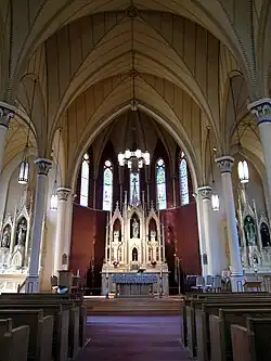 However, six years passed before Archbishop Purcell appointed the first priest to serve as the pastor on December 1, 1856. This man, Casper Wiese, quickly founded a parish school and bought a piece of land for use as a parish cemetery. A series of short-tenured pastorates followed Wiese's four-year time; the longest, that of Henry Fehlings, ended during the process of regional reorganization following the creation of the Diocese of Columbus. Fehlings' pastorate saw the parish expand outward from its small frame building: a brick addition to the church was constructed in 1865, a nearby store was purchased and converted into premises for the parish school, and a nearby house was purchased and converted into a rectory. By 1880, the parish had reached a membership of approximately seven hundred.[2] In 1886, the present house of worship, made of brick trimmed with sandstone and ornamental terra-cotta began to be constructed on William Street near downtown.[1] The cornerstone was laid in 1887 and the church was solemnly blessed by bishop John Watterson in October 1888.[4]