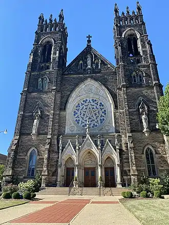 Built primarily of sandstone,[1] St. Mary's is a high Gothic Revival structure with a facade of two nearly identical towers and a Latin cross floor plan. The entire building measures 185 feet (56 m) from north to south and 85 feet (26 m) on the sides.[3] Sculptures are placed in small alcoves on the second stories of the towers and at the peak of the front gable, while windows and belfries occupy the higher stories of the towers. The main entrance comprises three adjacent portals underneath a large rose window at the center of the facade. Both the buttresses and the corners of the towers rise to decorative finials, while a large cross crowns the front gable.[5]