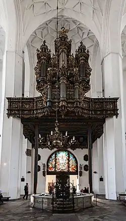 The inventories of St. Mary's reflect usage of Catholic-style accessories in Danzig's early Lutheran services. The inventory of 1552 still mentions a great stock of garments and embroideries.[6] The parishioners of St. Mary's formed a Lutheran congregation which - as part of Lutheran church polity - adopted a church order. A more elaborate church order (constitution) followed in 1612, the Alte Kirchenordnung. The first senior pastor (Erster Pfarrer, pastor primarius) of Danzig's Lutheran state church was Johannes Kittelius, pastor at St. Mary's between 1566 and 1590.[2] The church officially was called Supreme Parish Church of St. Mary's (Oberpfarrkirche St. Marien), indicating its prominent position in the city.