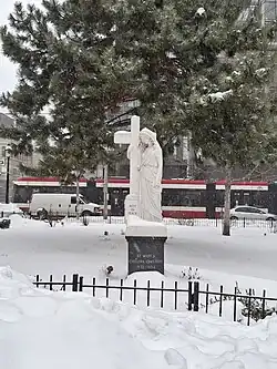 St. Mary's Church was built at McDonnell Square (now Portugal Square), which was one of several squares laid out in Toronto's 1834 'New Town Extension' plan such as Victoria Square, Clarence Square, and West Market Square. When Bishop Alexander Macdonell asked Lieutenant Governor Sir Francis Bond Head for land to build a church, he was granted a lot (Park Lot 32)[1] on the north east corner of the garrison reserve, given in part due to it having served as an emergency cholera cemetery during the epidemics that hit York (Toronto) in 1832 and 1834. This would only be discovered when the church foundations were being dug and human remains were uncovered.[2] The square was named for McDonell until 1960.[1]