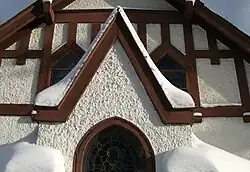 The exterior walls were covered with white stucco. The facades on the southwest end over the baptistery were partitioned by exposed wooden trim (trim and mouldings typical of 14th century Rural Gothic). This theme was also retained over the southwest entrance and within the chancel gable. Exposed timber structure was generalized along with asymmetrical massing and contrasting roof-levels.[11]