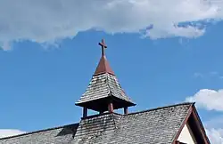 The exterior of the roof was composed of flat, rectangular shingles laid in rows from the bottom edge of the roof up, with each successive higher row overlapping the joints in the row below. A small campanile was attached to the apex of the roof not only as an ornamental detail (as it did not have any bell) but as a significant symbolism for the mission of this parish, as this type of small roof campanile was particularly a characteristic element of missional church architecture.[13]