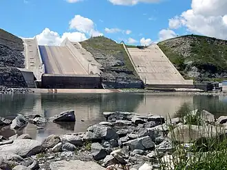 ![]() The disused (right) and replacement (left) spillways of St. Mary Reservoir | |