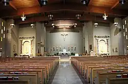 The Rev. John DeGroote bought 14 lots in the Oak Park addition of South Bend in 1921. Initial plans called for a building to house a combined church and school, but because the estimated cost of $35,000 was considered too expensive, Bishop Herman Alerding suggested a more modest wooden structure to serve temporarily as a church.[1] The Rev. Theodore Hammes was appointed as the parish's first pastor and initially lived at St. Monica's parish in Mishawaka. Twenty-two men volunteered to help build the church, which was constructed in May 1922 for $10,000.[1] The sanctuary was dedicated August 13, 1922, with a parish hall in the basement. The congregation quickly outgrew the structure's capacity of 240, and in October 1923, church leaders dedicated an expansion that increased the seating capacity to 600. The parish purchased six additional lots in 1924 which became the site of a school in 1929.