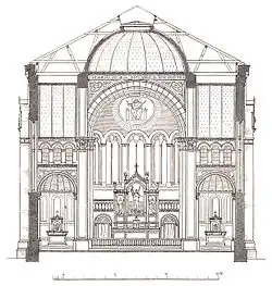 Construction went on from 1851 until 1861.[1] Soller died during the construction and was buried inside in 1856. As a result of financial difficulties, construction of the church stalled for some time. The building was completed by Andreas Simons, Martin Gropius, and Soller's nephew, Richard Lucae.[3] In 1896, the cost of the church's construction was estimated at 438,000 marks. The church was consecrated on 28 October 1861, by the Bishop of Breslau, in the presence of William I, Emperor of Germany.