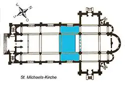The church is a hall church, i.e. the three aisles of the nave were all of the same height (before they were destroyed in the war). The architect, Soller, originally planned the church as a "Zentralbau" (i.e. a building with rotational symmetry). He adapted this idea into a basilica structure, roofing each bay so that they appeared as a series of "Zentralbauten" arranged one after another.