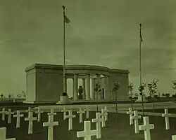 In the late 1920s, the architect Thomas Harlan Ellett, in collaboration with the sculptor Paul Manship, designed the architectural features of the cemetery, including a memorial peristyle with fluted Doric columns, and flanking it, a chapel and a museum. The project was approved by the National Commission of Fine Arts by 1930,[1] and completed in 1934.[2][3]