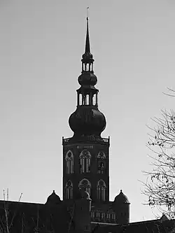 The western tower has a height of 99.97 metres (328.0 ft). The square lower part of the tower is in its upper parts decorated with blind arcades. The slightly smaller middle part is flanked by four turrets with domed copper spires, and it is also decorated with blind arcades. The top part is even slimmer and has blind arcades in two storeys, while the spire of the church is a Baroque, copper spire consisting of two round cupolas, each mounted by a lantern, and topped with a pointed spire. 60 metres (200 ft) up in the tower there is a panorama platform which can be reached by a stair with 264 steps.