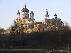 The Cathedral of St. Panteleimon (St. Pantaleon) is a large Eastern Orthodox cathedral in the Kyivan neighbourhood of Feofaniia. It shares similarities with the Alexander Nevsky Cathedral, Tallinn and is considered a high point in Russian Revival ecclesiastical architecture.