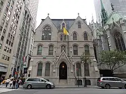 The cathedral's parish originally extended from Seventh Avenue to the East River between 46th and 59th Streets, and the section between Madison and Sixth Avenues extended to 42nd Street.[84][85] In 1880, the section between Third Avenue and the East River was split to the parish of St. John the Evangelist.[84][86] During the early 1880s, Renwick designed the archbishop's house and rectory on Madison Avenue.[87] The Real Estate Record and Guide reported in December 1881 that Renwick had been hired to build a rectory at the southwest corner of Madison Avenue and 51st Street.[88] Shortly afterward, Renwick filed plans for a four-story marble rectory on the site,[89] to be built by E. D. Connoly & Son and P. Walsh.[90] The archbishop's house was completed the same year.[86] The rectory was completed on May 8, 1884.[86] A critic for the Real Estate Record characterized the rectory and archbishop's house as having "absurd" dormer windows in their mansard roofs.[91] A memorial marble pulpit was manufactured in Italy and installed in the cathedral in October 1885. The money for the pulpit came from the clergy of the archdiocese, who had offered Cardinal McCloskey $10,000 for his golden jubilee and commissioned the pulpit after he had declined the prize.[92]