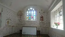 St. Patrick's Chapel in Glastonbury, Somerset, England, is housed within the grounds of Glastonbury Abbey, and was completed in 1517. It is a site of pilgrimage and dedicated to Saint Patrick due to it being close to a possible site of his burial. It sits within the scheduled Ancient Monument area and is a Grade II listed building. The Stained Glass and wall painting are the results of a renovation. Saint Patrick is depicted twice within the chapel, once within the stained glass behind the altar which shows him in his traditional green robe standing above a snake and another on the wall which depicts him with a wolfhound. Weekly services are still held within the Chapel and it 'has been witness to 500 years of Christian worship.'[1]