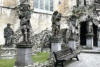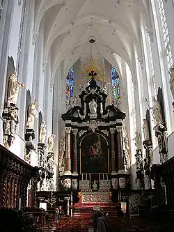 The initial phase of the rebuilding of the monastery was undertaken between 1605 and 1616 and reconstruction was completed in 1662. In 1618 the first stone was laid of a new and enlarged choir and transept. In 1639 the new choir was consecrated by the Bishop of Antwerp. During the following decades, the interior of the church was fitted out with Baroque furniture and decoration. The Antwerp sculptor Pieter Verbrugghen I and his workshop made the oak confessionals between 1658 and 1660.[3] The same artist made the oak organ case in the church in 1654 and together with his son Pieter Verbrugghen II he executed the designs for the high altar in 1670.[4] The high altar was dedicated in 1670 by Mgr. Capello of Antwerp. In 1679 a major fire destroyed part of the vaults of the nave and the upper part of the western facade. The damage was repaired in 1680-81 and at the same time the top of the tower was finished in a Baroque style after a design by Nicolaes Millich. In 1692 the Venerable Chapel was completed. The Calvary was constructed against the south side of the nave between 1697 and 1747.[2]