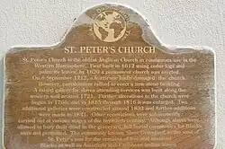 Their Majesties Chappell, St. Peter's Church, in St. George's, Bermuda, is the oldest surviving Anglican church in continuous use outside the British Isles.[1] It is also reportedly the oldest continuously used Protestant church in the New World.[2] A UNESCO World Heritage Site (together with related fortifications), St. George's Town is the oldest surviving English settlement in the New World,[3] having been settled by the Virginia Company in 1612[4] (in the aftermath of the wrecking of its flagship, the Sea Venture, in Bermuda in 1609).