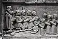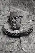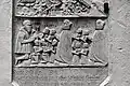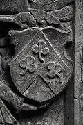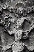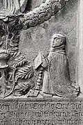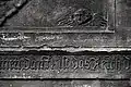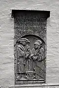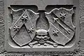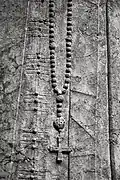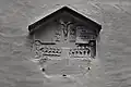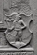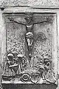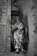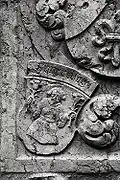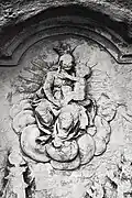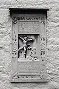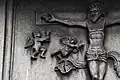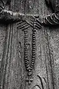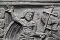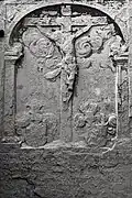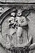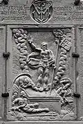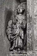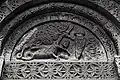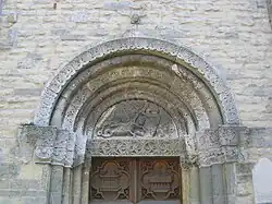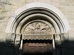 Two portals provide access to the building, one from the west and one from the south. The tympanum of the west portal portrays a knight, armed with sword and shield, battling a dragon. The head of a man, whom the dragon has swallowed, is visible between its jaws. The representation may allude to the words of Psalm 35/34: