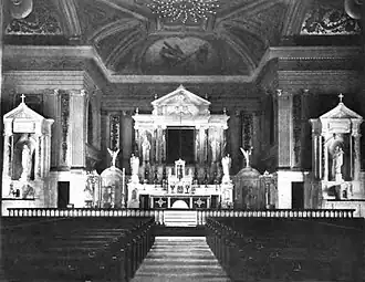 In October 1836, the cornerstone for a larger St. Peter's Church was laid, and by February 1838 the current structure was built. In addition to Roman Catholic services, from 1899 to 1916 St. Peter's also hosted services in the lower church for Byzantine-rite Syrian and Lebanese Catholics, who during that period did not have their own church.[11] St. Peter's Church is the first place Fr. Edward Frederick Sorin, founder of the University of Notre Dame, celebrated Mass upon his arrival in America in 1842.