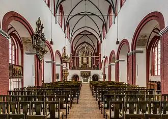 The interior is characterized by white walls with accented red bands along arches, windows and ribbed vaults. The main arches along the nave are rounded in the older Romanesque style whereas the ribbed vaults and windows are in later pointed Gothic style. The church is richly decorated with works of art from the Middle Ages to the 20th century.[1] There are several elaborate stone epitaphs for local clergymen and dukes. The wooden pulpit contains elaborate carvings with floral motifs and colored statues of Peter and Paul.