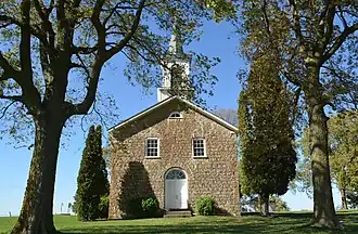 Land for the church building was purchased for $30 an acre from Eli Carlan.[2] Gerhard Bierbaum deeded another acre for a total of 6.16-acre (2.49 ha). The church members quarried the stone from the Bierbaum quarry. The cornerstone for the church was laid on October 25, 1858. The building measures 55 by 30 feet (16.8 by 9.1 m), with the 12-foot (3.7 m) length in the back reserved for the pastor's quarters. The structure was built for less than $1,100.[2] A well of 35 feet (11 m) deep and 5 feet (1.5 m) in diameter was dug by Sebastian Walsh for a $1.00 a foot until he hit rick and then he was paid $1.15 a foot.[2]