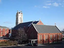 The cathedral shares its historic designation with the parish rectory and its former convent and school building. The rectory, which is adjacent to the cathedral on the north, was built around 1870. The three-story brick dwelling is considered the finest example of the Italianate style in the Cathedral District.[1] The house features a low hipped roof, paired brackets on the eaves, simple window hoods, and an entrance canopy. The main entrance is flanked by side lights and it has a fan light above. The ironwork detailing and the doors were originally on the mansion of A.A. Cooper, which was named Greystone and was torn down in the late 1950s.