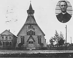 Photograph of the front of the first St. Rose of Lima Roman Catholic Church building that was built in 1886. The photograph was taken in 1906. The inset is of Father Henry F. Murray, who was pastor of St. Rose of Lima from 1900 to 1911.