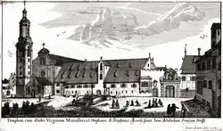 The monastery, dedicated to Saint Stephen, was founded in 968 by Saint Ulrich, Bishop of Augsburg, and used by Augustinian canonesses. It was dissolved in the secularisation of Bavaria in 1803, and the premises passed into the possession of the town. The army used the site for a few years as a quartermaster's store.