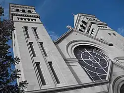 A new south rose window was created by Conrad Schmitt Studios of New Berlin, Wisconsin to replace the original destroyed in a fire in 1955.[5] The twenty-two foot window "was designed with the theme ‘Sun of Splendor,’ symbolizing God and the blessings that radiate from him. Eight doves represent the beatitudes, while twelve angels holding stars symbolize the twelve divine praises."[6]