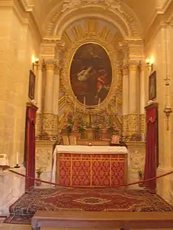The titular painting depicts St Agatha, patroness of Malta, together with St Adrian, the work of Giuseppe D'Arena.[3]