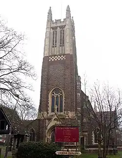 The west tower was completed in 1932 by Charles Bateman. The lych-gate in the churchyard was designed by James A. Swan[4] and installed in 1938. In the interior Swan designed the panelling, choir stalls, pulpit, lectern, screens and doors dating from 1939 which was carved by Robert Pancheri of The Bromsgrove Guild of Applied Arts.