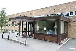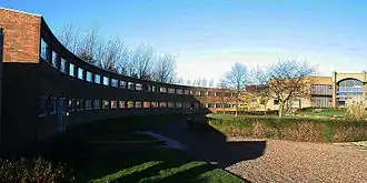 In 1961 St Aidan's was reconstituted as a full "council college", meaning that its governing council is a sub-committee of the university council, the university's governing body. It moved to its present buildings on Elvet Hill in September 1964, becoming one of the first of the university's "Hill" colleges.[4] The college buildings are in a brutalist style, designed by Sir Basil Spence and arranged in a semi-circular arrangement surrounding a central lawn.[5][6] The original design was intended to represent the hand of God holding a jewel, with the curved corridors as the fingers, the straight corridors as his thumb, and a small chapel as the jewel. However, financial constraints prevented the chapel from ever being built and later extensions to the straight section did not follow the original idea.