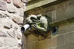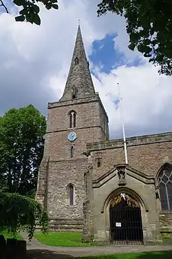 The church is built of Triassic sandstone.[3] The north aisle was added in the 13th century, as was the tower, which now has a broach spire.[4] The 14th century saw the chancel, which is longer and wider than the nave,[5][4] being built and the north aisle enlarged.[2] The south aisle was added the following century and a clerestory was added.[5]