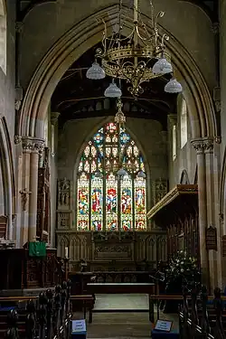 The church is medieval but was substantially rebuilt in 1536[5] and again in 1866 by James Green of Todmorden at a cost of £3,600. The roof and walls were in such a ruinous condition as well as the original arches and piers of the nave, that they could not be preserved, and so the whole church, with the exception of the lower portion of the tower was rebuilt. The clerestory was raised 3 feet (0.91 m) and pierced by six windows on each side, filled with geometric tracery. The east window illustrating the life of the Saviour was made by Clayton and Bell, the gift of H.T. Robinson of Edgley, Leyburn.[6]