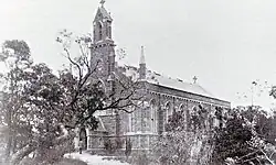 By 1857, the congregation had outgrown the second church building.[4] The parishioner, Brighton resident and prolific Melbourne architect Charles Webb, and his partner Thomas Taylor, were commissioned to design a new bluestone church, school house and vicarage.[9] "King Webb" designed the new bluestone church in the Early English Gothic style, with a prominent bellcote surmounting the gable, a small gabled western entrance porch, a seven-bay nave and small chancel. Webb's building was considered "one of the more perfect examples of a church of the period in the Colony"[10] and the majority of the building, including the distinctive western facade, remains a Brighton landmark.