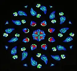 The south transept features a large and richly traceried rose window above the exposed pipework of the transept division of the pipe organ; the rose window tracery, with its "leaf-like pattern" also provides a subtle link to the Tree of Life west window.[10]
