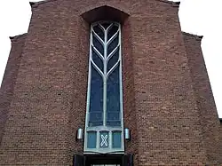 The west window tracery was designed to suggest the branching of a tree; the impression is enhanced by the inclusion of leaf-shaped russet-coloured glass at the apex of the window and the large double-winged organ cases branching out from the "tree".[4]
