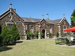 In 1886, a north wing was added to the school house building, creating the symmetrical H-shaped building which survives today. Designed in a Gothic Revival style, the symmetrical H-shaped school house is constructed of random coursed, locally quarried ironstone and is roofed in slate. It has projecting gabled end wings, a central projecting entry porch and render detailing that includes parapets, finials, angle buttresses, window and door surrounds and gable vents. When additions were made to the church building in 1886, the altar and furnishings from the demolition of the chancel were installed in the central space of the school house.[7] The building is currently used as a café and coffee shop.