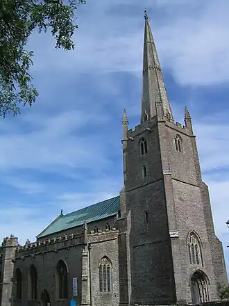 The church was remodelled in the 15th century, in a Perpendicular style; further restorations followed in 1825, 1856 and 1950–2.[1] The nave includes pillars with decorated stone corbels supporting the wooden roof timbers and carved bosses. The organ, which was rebuilt in 1967 is in the chancel. The Merle chapel was formerly known as the Chapel of St Congar. The font is Norman. The tower is surmounted by a spire which rises to 120 feet (37 m).[5]