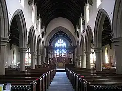 The church was probably originally built in the 16th century, from which period the tower survives.[1] In 1674, the vicar demolished the large rood screen, which doubled as an organ loft. Unfortunately, the screen also played a structural role, and the action caused part of the roof to collapse, and the south aisle to become unusable.[2] It was repaired, but the bulk of the building was later demolished and rebuilt in 1852 by Rhode Hawkins, in the Perpendicular style. It was grade II listed in 1954.[1]