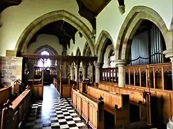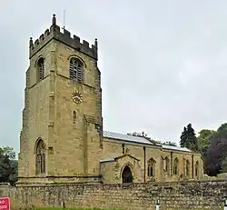 The church is built of stone with lead roofs, and consists of a nave with a north aisle, a south porch, a chancel with a north aisle, and a west tower. The tower has three stages, a plinth with a carved frieze, diagonal buttresses, a south buttressed stair turret, and a three-light Perpendicular west window with a hood mould. In the south front is a small ogee-headed opening and a clock face, the top stage contains three-light bell openings, above which is an embattled parapet with corner pinnacles. The south doorway has a round arch, two orders of columns with scalloped capitals, and three orders of arches with zigzag decoration. Inside, there is a 13th-century sedilia, and the east end of the north aisle has been made into a chapel, with furnishings by Robert Thompson.[2][3]