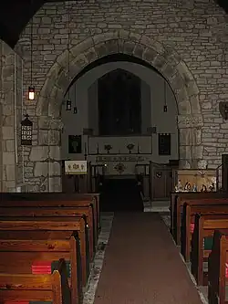 The church is built of sandstone, the roof of the nave and porch are tiled, and the chancel has a stone slate roof. The church consists of a nave, a north aisle, a south porch, and a chancel with a north vestry. On the west gable is a gabled bellcote with twin arches and a cross. In the porch is a small re-set Norman window, and the doorway contains part of a roll-moulded arch. The 15th-century east window has been reset in the north wall. Inside, there is a piscina with elements from the 12th and 13th centuries, an octagonal 17th-century font, and an alms box which may be 17th century.[2][3]