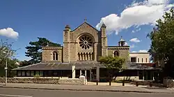 The building was designed by A.R.G. Fenning[2] (1855–1937). It is in a neo-Norman style with four bays and two aisles alongside the large clerestoried nave. The chancel is a semi-circular apse with stained glass windows of biblical scenes. A west gallery augments the seating capacity, above which is the west rose window, a stylised version of which is used as the church logo. Some original plans for the building included a large campanile tower, but no money was available for it. There is a small bellcote on the south-west side.